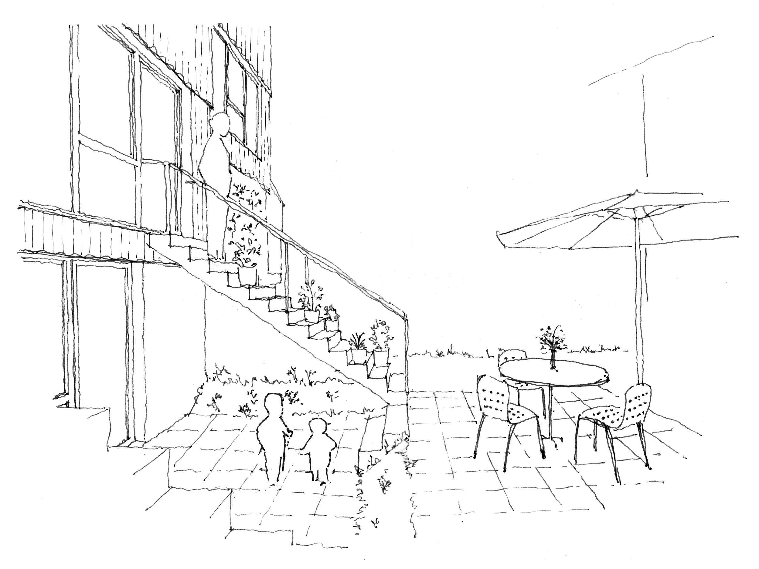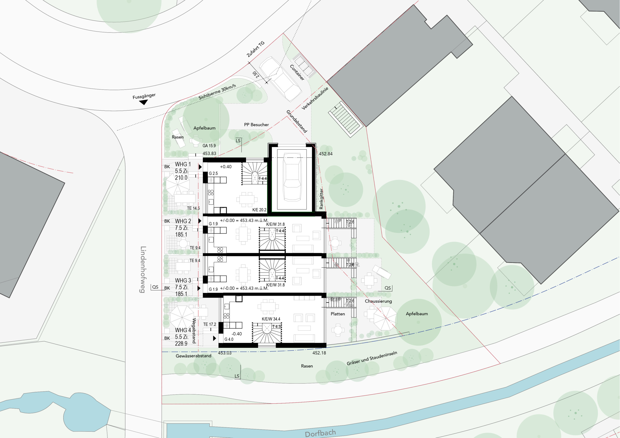 Vier zueinander versetzte Reiheneinfamilienhäuser betten sich in das abfallende Grundstück nahe des Dorfbachs. Eine klare räumliche Organisation mit grosszügiger Treppe im Gebäudeinneren ermöglicht eine flexible Nutzung der Zimmer. Zweiseitige Bezüge zu den Aussenräumen vom Eingangs- und Wohngeschoss sowie vom Untergeschoss bieten ein Maximum an nutzbaren Aussenräumen. Traditionelle Gestaltungselemente aus der Umgebung, wie ein massives Sockelgeschoss und leicht verkleidete Obergeschosse, binden das Haus in den Kontext ein.