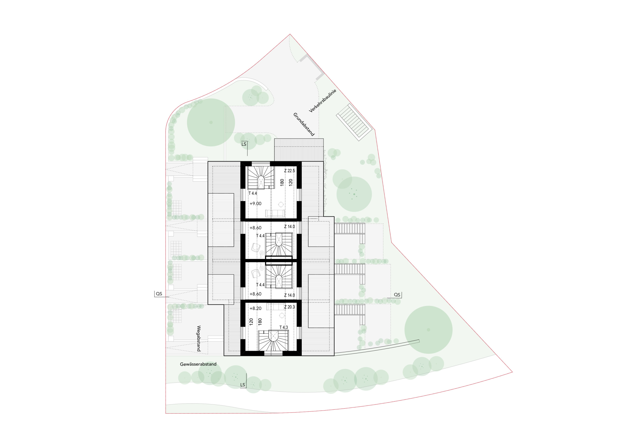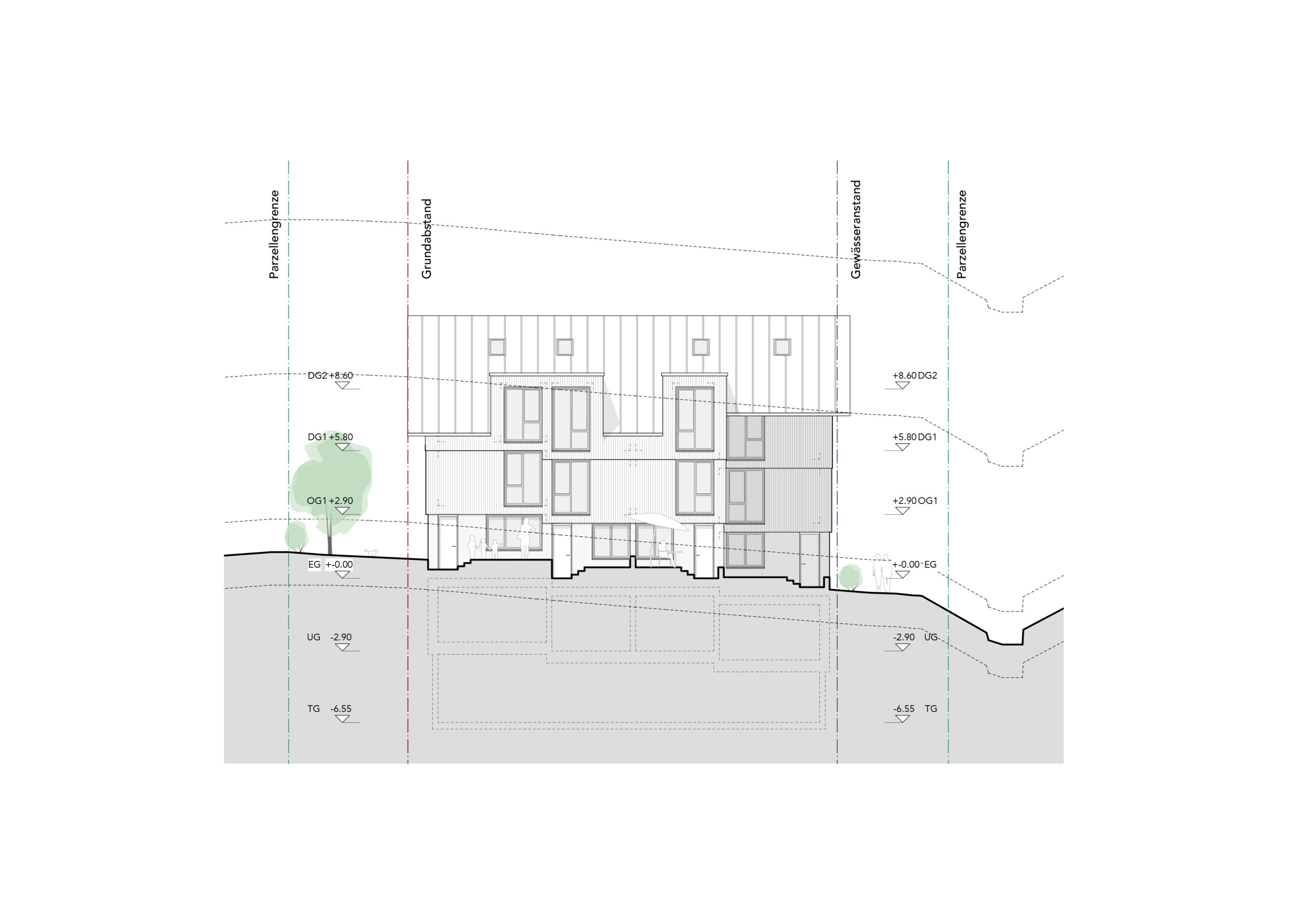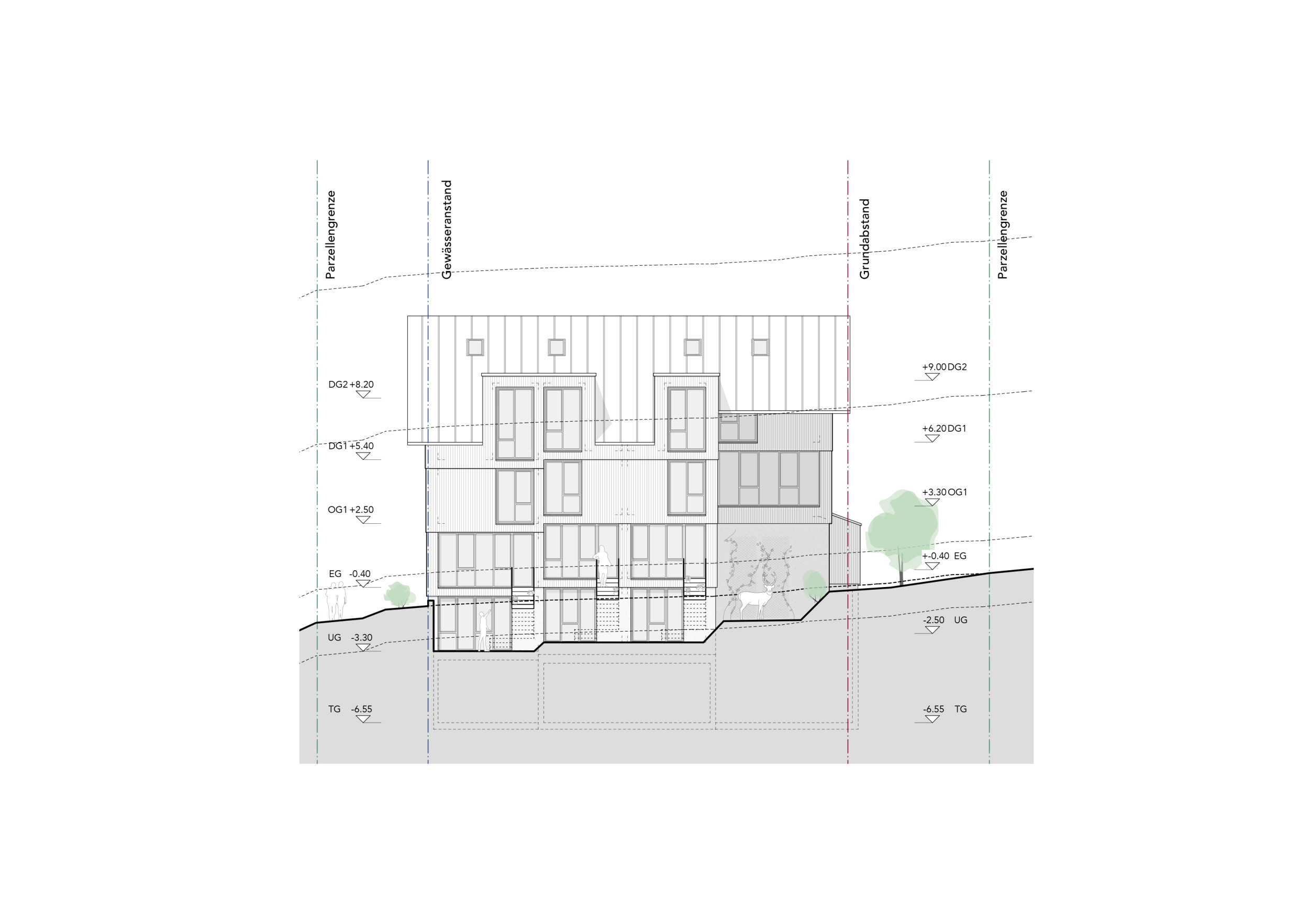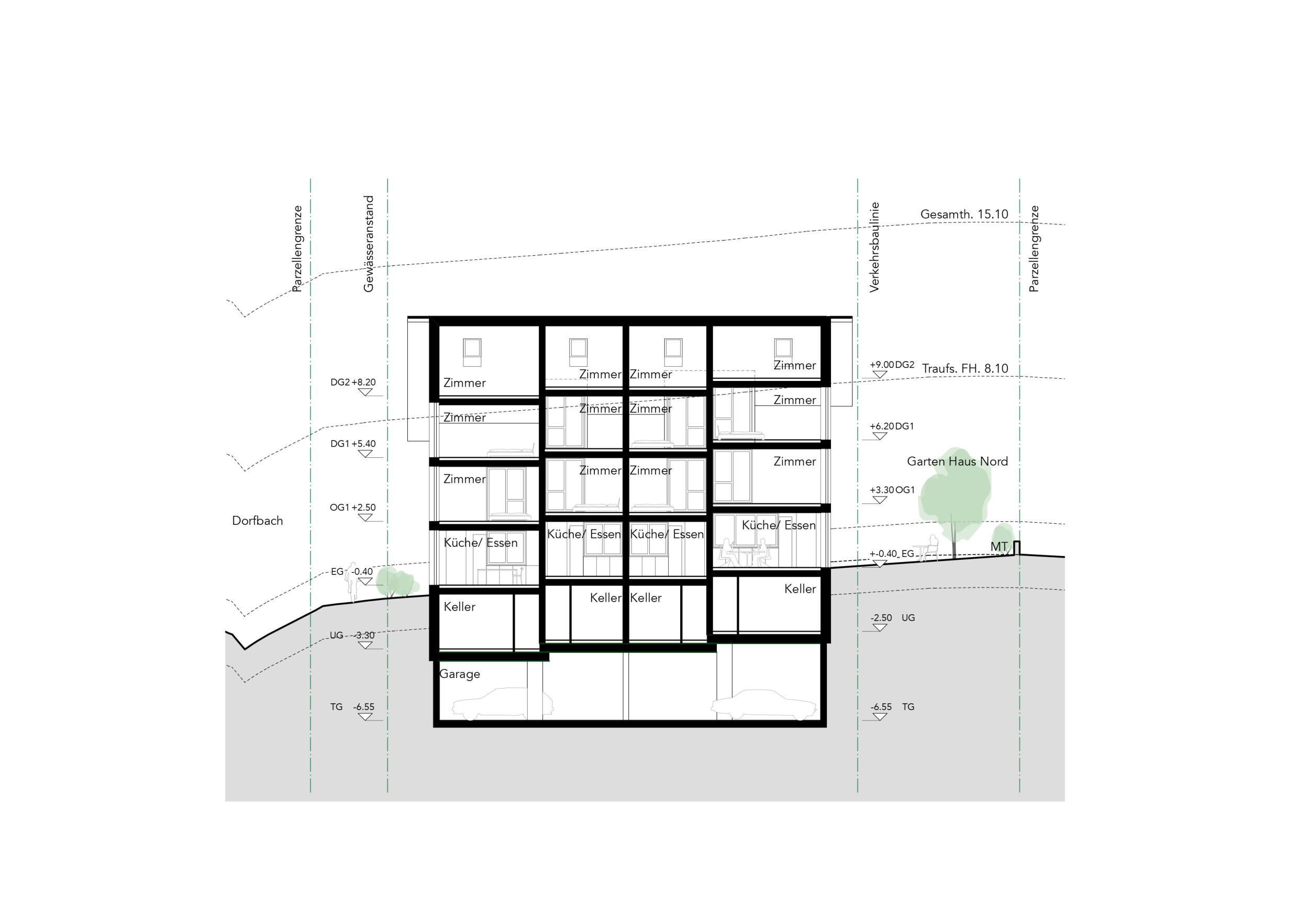 Vier zueinander versetzte Reiheneinfamilienhäuser betten sich in das abfallende Grundstück nahe des Dorfbachs. Eine klare räumliche Organisation mit grosszügiger Treppe im Gebäudeinneren ermöglicht eine flexible Nutzung der Zimmer. Zweiseitige Bezüge zu den Aussenräumen vom Eingangs- und Wohngeschoss sowie vom Untergeschoss bieten ein Maximum an nutzbaren Aussenräumen. Traditionelle Gestaltungselemente aus der Umgebung, wie ein massives Sockelgeschoss und leicht verkleidete Obergeschosse, binden das Haus in den Kontext ein.