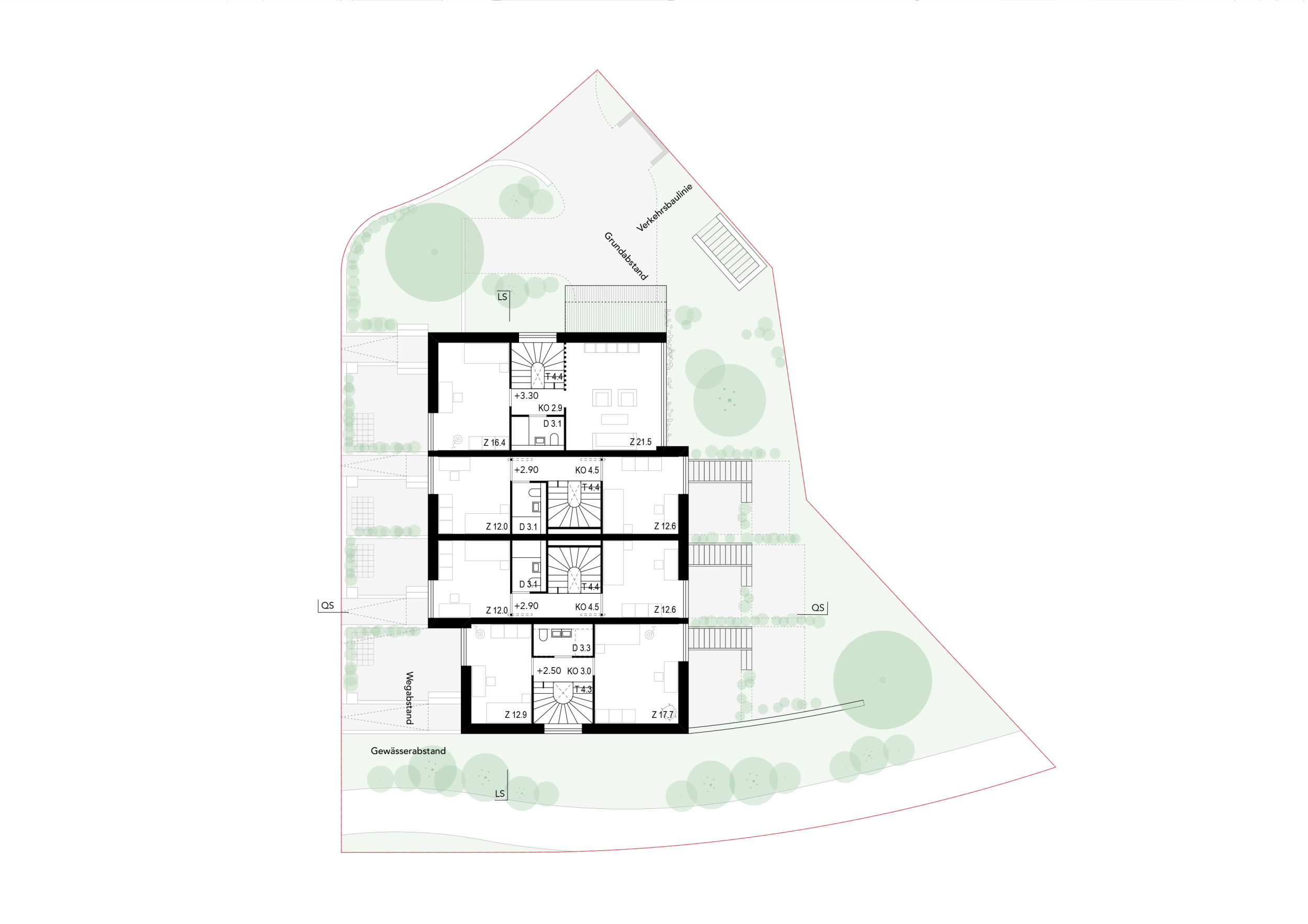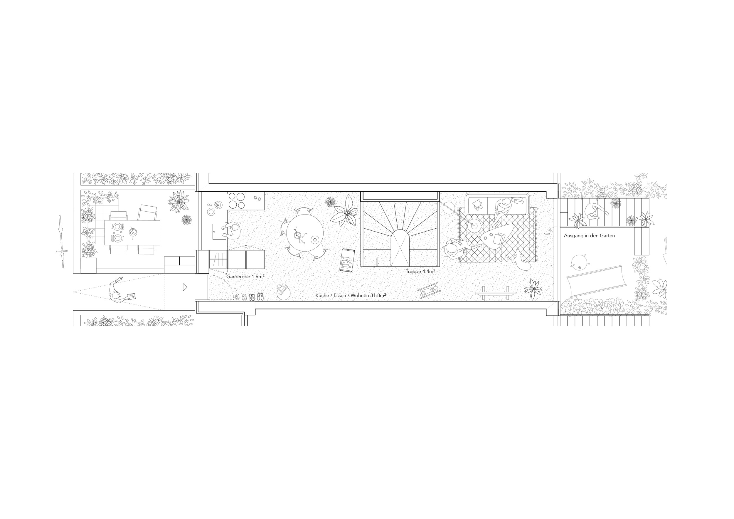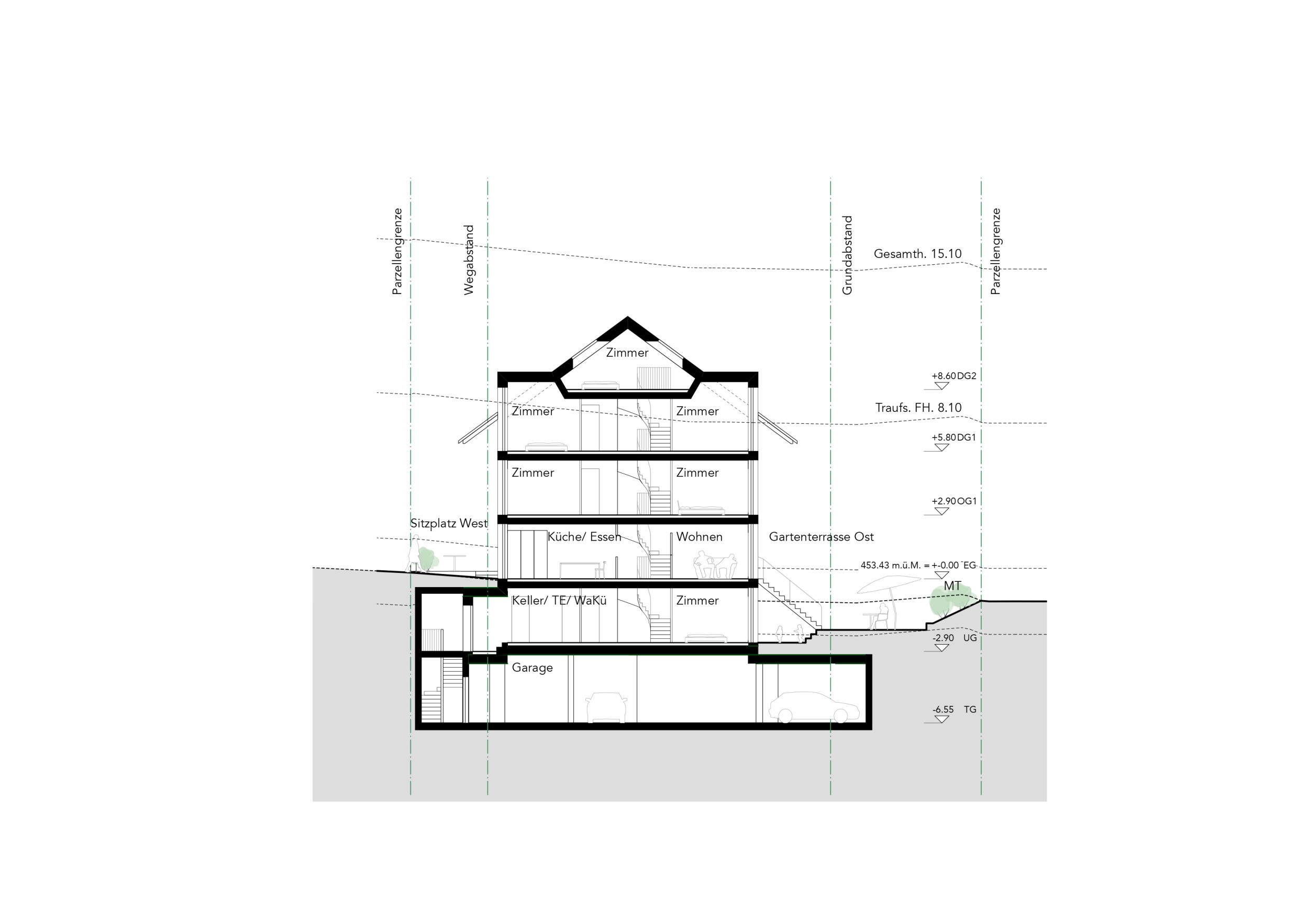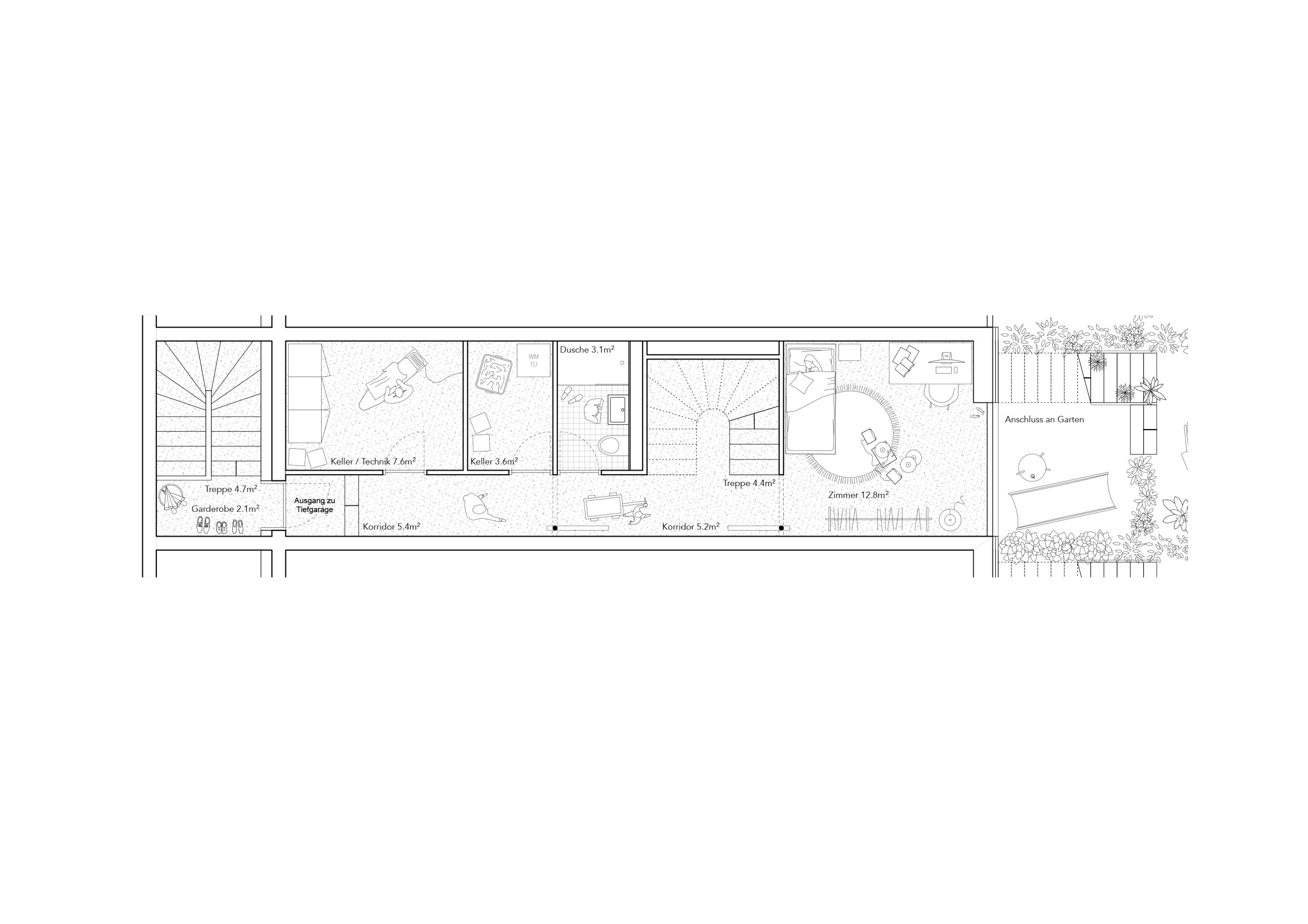 Vier zueinander versetzte Reiheneinfamilienhäuser betten sich in das abfallende Grundstück nahe des Dorfbachs. Eine klare räumliche Organisation mit grosszügiger Treppe im Gebäudeinneren ermöglicht eine flexible Nutzung der Zimmer. Zweiseitige Bezüge zu den Aussenräumen vom Eingangs- und Wohngeschoss sowie vom Untergeschoss bieten ein Maximum an nutzbaren Aussenräumen. Traditionelle Gestaltungselemente aus der Umgebung, wie ein massives Sockelgeschoss und leicht verkleidete Obergeschosse, binden das Haus in den Kontext ein.