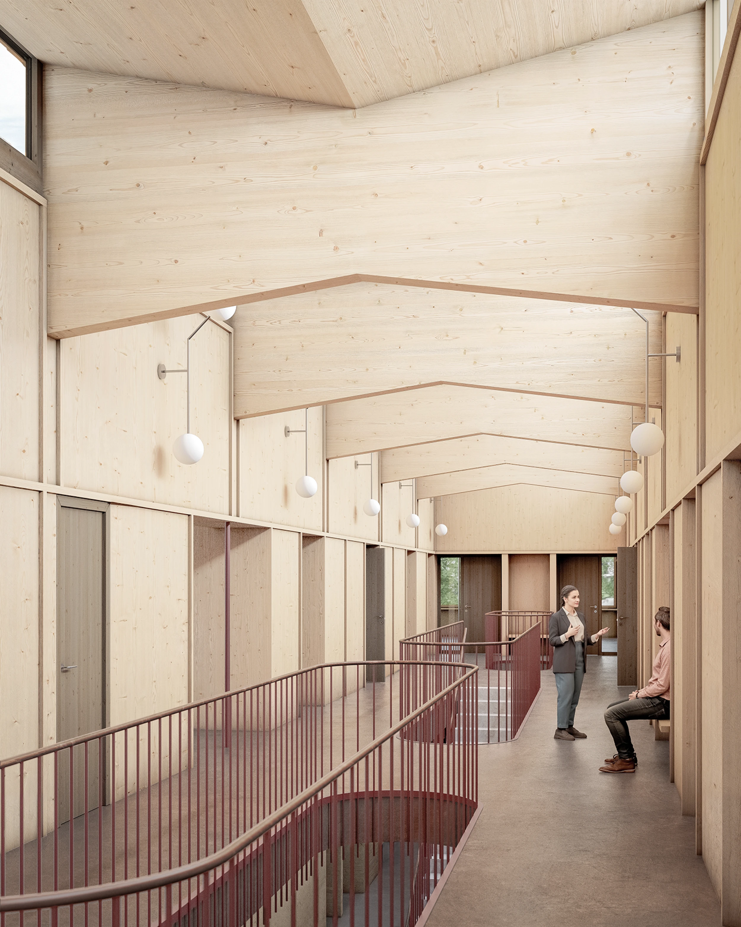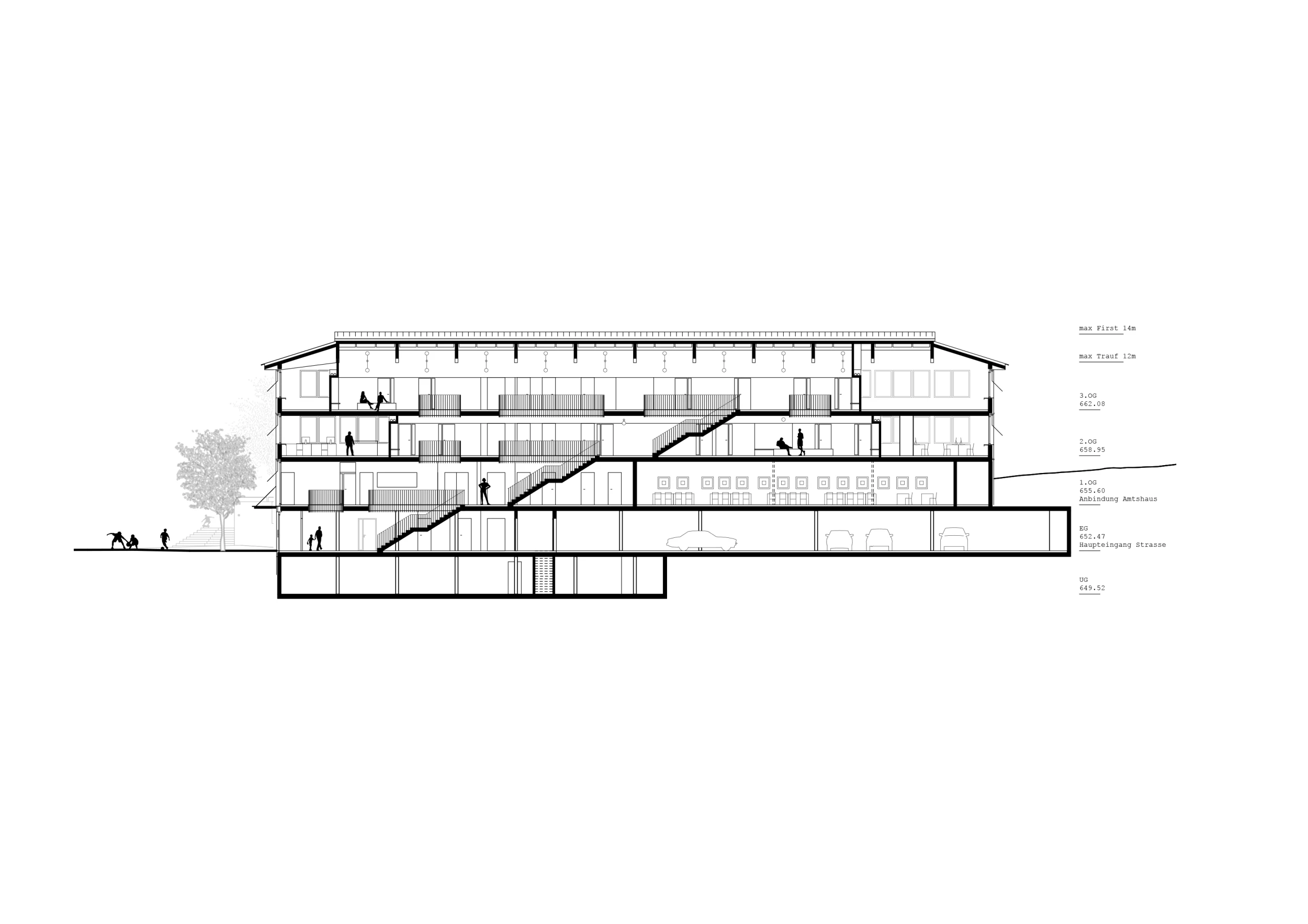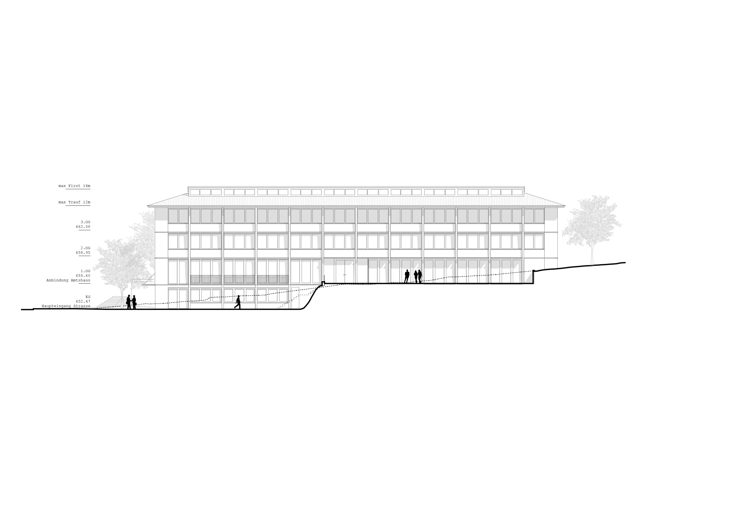 Das architektonische Konzept des neuen Gemeindehauses Tafers versteht sich als identitätsstiftende Antwort auf die Gemeindefusion von Tafers, Alterswil und St. Antoni. Der langgestreckte Holzbau bildet gemeinsam mit dem bestehenden Amtshaus ein neues Verwaltungszentrum und symbolisches Gemeinschaftshaus. In seiner klaren, horizontal gegliederten Form fügt er sich sensibel in die kleinteilige Dorfstruktur ein und vermittelt zwischen lokaler Bautradition und zeitgemässer Offenheit. Eine zentrale, lichtdurchflutete Erschliessungszone mit Kaskadentreppe verbindet alle Geschosse und schafft räumliche und visuelle Bezüge zwischen Verwaltung, Öffentlichkeit und politischem Leben. Die Holzbauweise mit hohem Vorfertigungsgrad, natürlichen Materialien und Minergie-Standard verkörpert Nachhaltigkeit, Flexibilität und Dauerhaftigkeit.